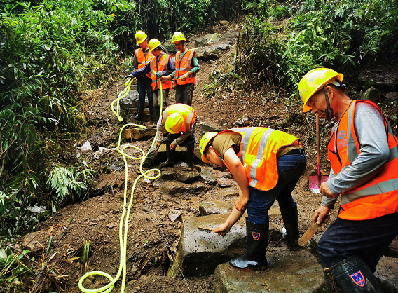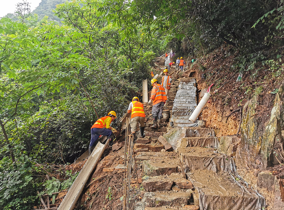可即便施工環(huán)境如此艱苦,他們也未曾對(duì)施工質(zhì)量放松一絲一毫的要求。剛進(jìn)場(chǎng)時(shí),有一次工人們?cè)谔莸朗┕さ胶蟀胍?,才完成了?dāng)天三十余米的施工任務(wù)。但沒想到,第二天一早工人到現(xiàn)場(chǎng),才發(fā)現(xiàn)因天黑看不清楚,昨夜修好的梯道不夠美觀,于是他們二話不說,將梯道拆了重新施工,達(dá)到要求才罷休。